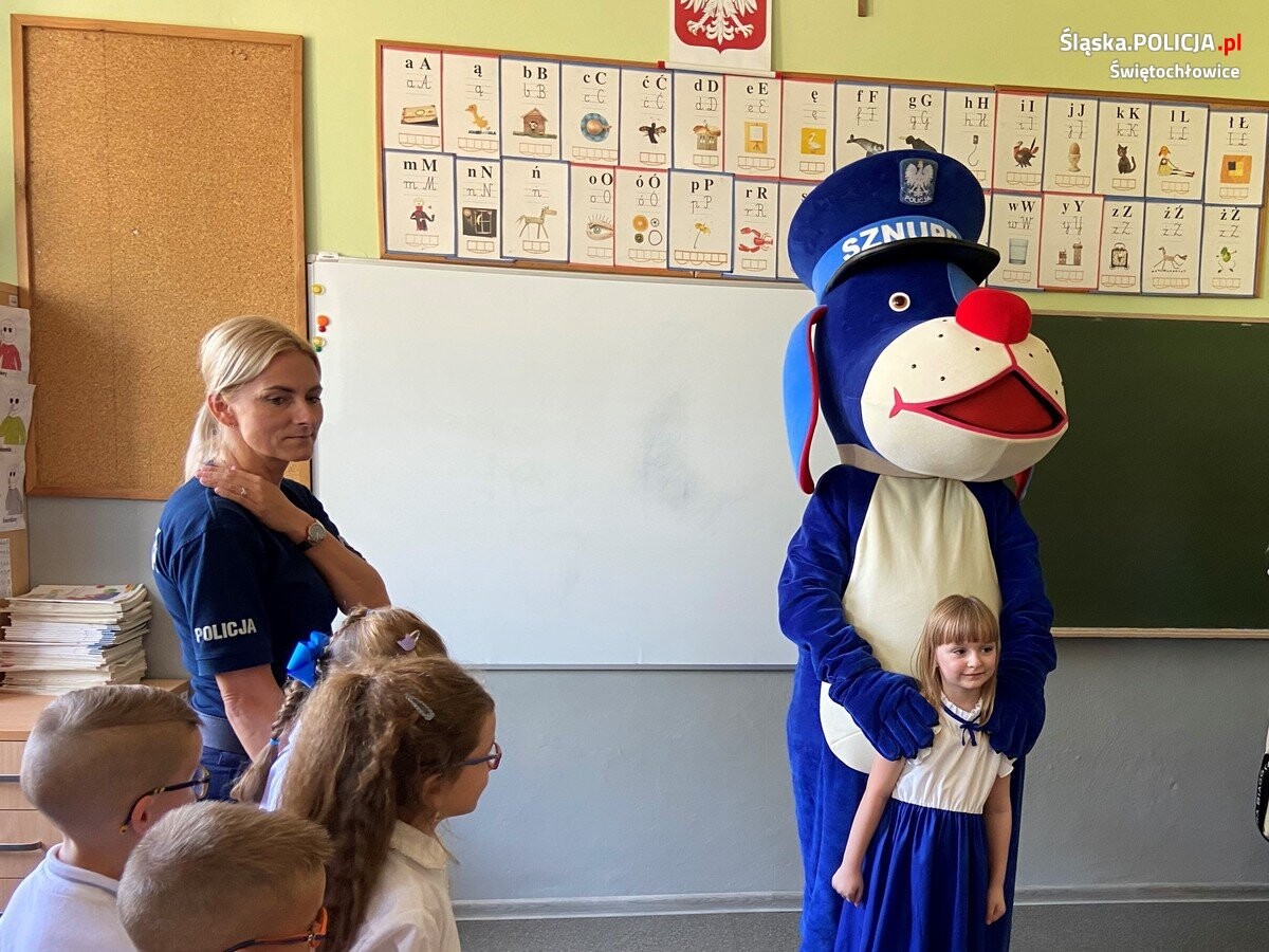 Uczniowie klas pierwszych mieli okazję poznać maskotkę śląskiej policji oraz posłuchać rad na temat bezpieczeństwa i zasad ruchu drogowego.