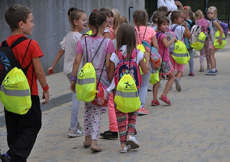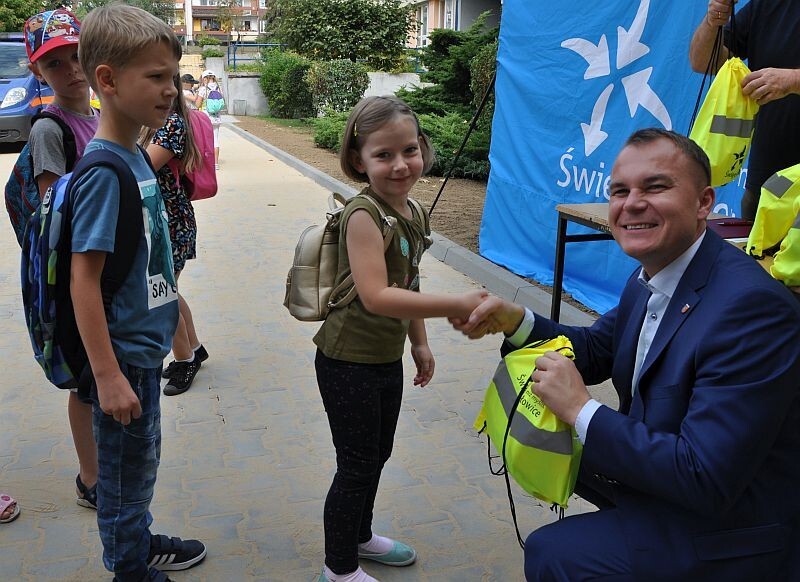 Prezydent Świętochłowic Dawid Kostempski wręczył pierwszakom odblaskowe plecaki i opaski. Warto dodać, że odblaski są jednym z podstawowych elementów bezpieczeństwa, bowiem znacząco poprawiają widoczność dzieci na drodze.