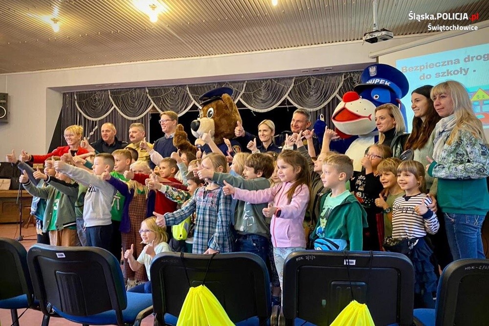Maskotki służb, czyli pies "Sznupek" i miś "Świonek", które odwiedziły uczestników w sali, cieszyły się jak zwykle ogromną popularnością. Każdy uczeń biorący udział w akcji otrzymał drobny, odblaskowo-słodki prezent.