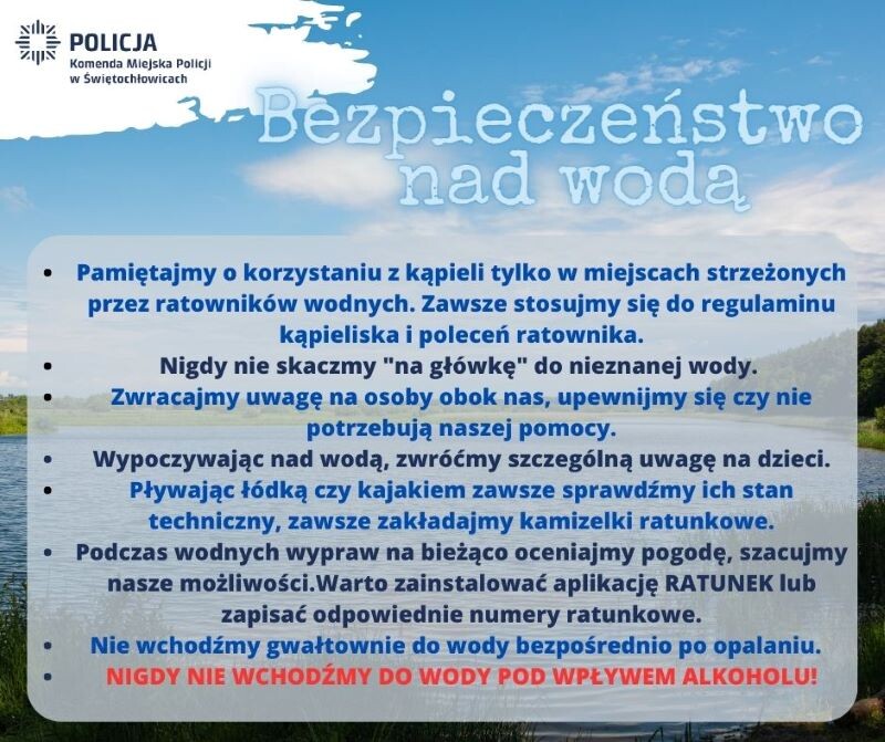 W okresie letnim świętochłowiccy policjanci podejmują szereg działań profilaktycznych ukierunkowanych na zapewnienie bezpieczeństwa wypoczywającym na terenie miasta, informując ich jednocześnie o zagrożeniach wynikających z nielegalnych kąpieli, gównie dla życia i zdrowia. Z uwagi na odnotowane przypadki utonięcia na terenie województwa śląskiego mundurowi nie tracą czujności i apelują o zachowanie rozwagi. Policjanci przypominają, że kąpiel w miejscu zabronionym, jest nie tylko wykroczeniem opisanym w przepisach prawnych, za które grozi grzywna, ale coraz częstszą przyczyną tragedii. Dzielnicowi z rejonu Świętochłowic w ramach codziennych czynności kontrolują rejon akwenów na terenie miasta by zapewnić mieszkańcom maksymalne bezpieczeństwo.