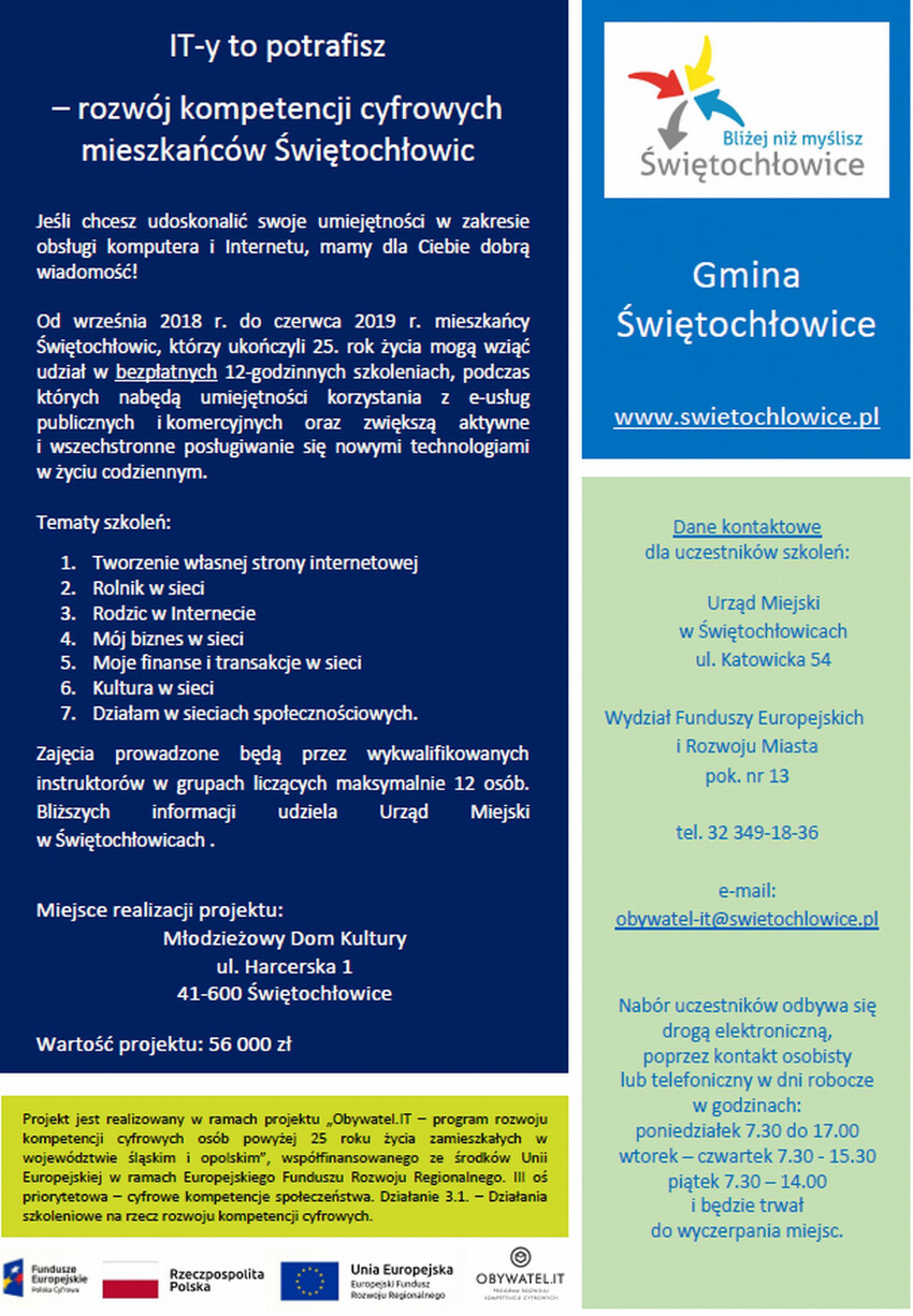Szczegółowych informacji na temat projektu udziela Wydział Funduszy Europejskich i Rozwoju Miasta ( pok. nr 13) świętochłowickiego magistratu – tel. 32 34-91-836, mail: [email protected]