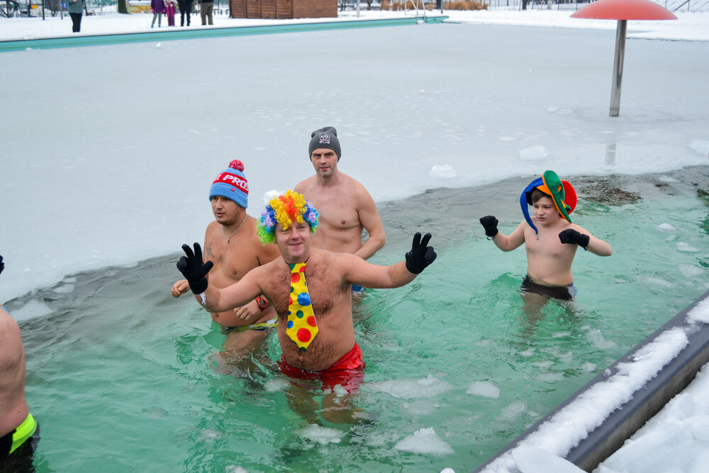 Około godziny 13 do jednego z basenów (wcześniej skuto na nim lód) weszło ponad 200 morsów, z prezydentem Danielem Begerem i grupą Harciole na czele. Pół godziny później podziwialiśmy walkę w wiosce wojów. Starli się ze sobą Rus i jeden z Normanów, którzy pojedynkowali się na topory bojowe.