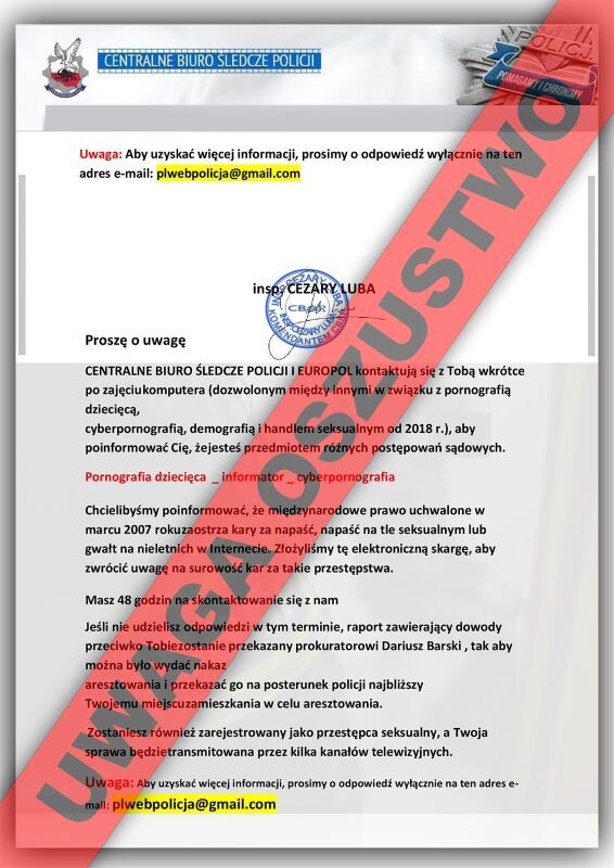 Policjanci z Centralnego Biura Śledczego Policji ponownie ostrzegają przed oszustami, którzy za pomocą fałszywych wiadomości e-mail próbują wyłudzić dane osobowe i pieniądze. Przestępcy podszywają się pod funkcjonariuszy CBŚP, rozsyłając informacje o rzekomym „zajęciu komputera” z powodu wykrycia przestępstw, takich jak pornografia dziecięca. W wiadomościach grożą rejestracją odbiorcy jako przestępcy seksualnego oraz zapowiadają „transmisje w mediach”. Jest to kłamstwo mające wywołać panikę i wymusić działanie.