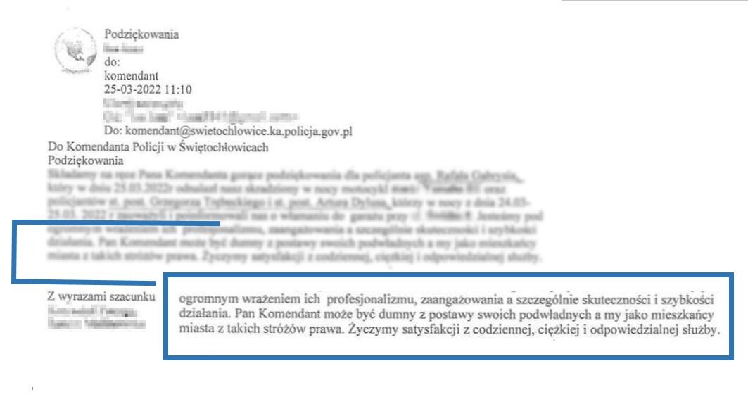 „Pan Komendant może być dumny z postawy swoich podwładnych, a my jako mieszkańcy miasta z takich stróżów prawa”. Takie słowa uznania wpłynęły na ręce szefa świętochłowickich policjantów od mieszkańców miasta. Świętochłowiczanie podziękowali mundurowym za ich zaangażowanie, profesjonalizm i skuteczność, dzięki którym odzyskali skradziony motocykl.