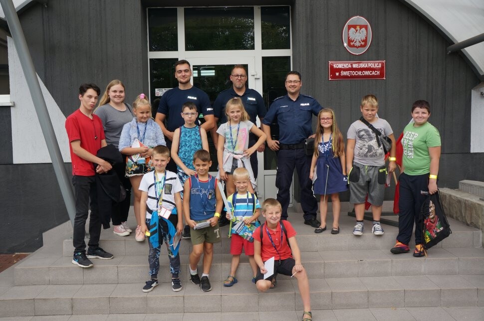 Świętochłowicką komendę odwiedziły dzieci ze Świetlicy Środowiskowej „PROMYK”. Dzieci zostały przywitane przez dzielnicowych oraz świętochłowickiego profilaktyka sierż.szt. Marcina Michalika. Odwiedziny zaczęły się od wycieczki po całej komendzie, dzieciaki mogły zajrzeć do policyjnego aresztu, pokoi gdzie policjanci prowadzą przesłuchania oraz policyjnej sali ćwiczeń. Na koniec w sali odpraw dzielnicowi przypomnieli uczestnikom wycieczki jak dbać o własne bezpieczeństwo podczas trwających wakacji oraz jak prawidłowo zachowywać się nad wodą. Spotkanie zakończyło się na specjalnym stanowisku Technika Kryminalistyki, gdzie każdy mógł pobawić się w policjanta i zabezpieczyć odciski palców odbitych wcześniej na szybie.