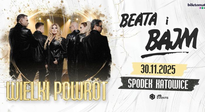 30 listopada 2025r w Andrzejki, Spodek Katowice zamieni się w rockową stolicę Polski. Jedna z największych ikon polskiej sceny muzycznej – Beata wraz z zespołem BAJM – powraca na wielką trasę koncertową! To wyjątkowa okazja, by usłyszeć na żywo największe hity, które od lat poruszają serca fanów. Energetyczne show, niezapomniane emocje i niepowtarzalny głos Beaty – to gwarancja muzycznego święta.