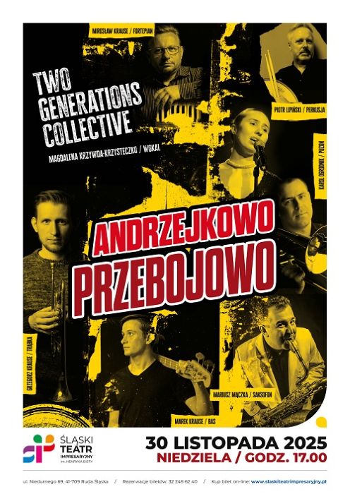 Two Generations Collective zaprasza na wyjątkowy wieczór z największymi przebojami muzyki rozrywkowej, zarówno polskimi jak i światowymi. Znakomite opracowania, ciekawe interpretacje i rozśpiewana publiczność. Obok ponadczasowej, kojarzonej głównie z Rayem Charlesem - "Georgia on My Mind", poprzez "Hello" - Lionela Richie czy "Waterloo" - zespołu ABBA, aż po rodzime "Moje serce to jest muzyk" - Ewy Bem czy wielki przebój Anny Jantar - "Tyle słońca w całym mieście". Te i wiele innych utworów, które każdy słuchacz rozpozna już od pierwszych dźwięków gwarantują znakomitą "Andrzejkową" zabawę.