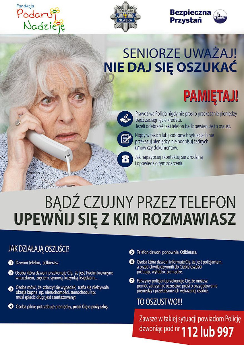 Mundurowi z Komendy Miejskiej Policji w Świętochłowicach ostrzegają przed osobami, które podszywając się pod policjantów, prokuratorów, członków rodziny albo pracowników różnych instytucji, usiłują wyłudzić pieniądze. Do świętochłowickiej komendy ponownie dotarły sygnały o próbach wyłudzenia pieniędzy od osób starszych. Pomimo przeprowadzanych akcji profilaktycznych i wielokrotnych apeli ze strony policjantów, wciąż dochodzi do zdarzeń, w których pokrzywdzonymi są seniorzy. Oszuści grasujący w regionie, podszywają się pod zawody, które cieszą się zaufaniem społecznym. Niestety wczoraj śledczy świętochłowickiej komendy odnotowali kolejny przypadek wyłudzenia pieniędzy od jednej z mieszkanek miasta. W ciągu ostatnich dwóch dni telefony od fałszywych funkcjonariuszy odebrali kolejni seniorzy. Oszuści przedstawiają się za policjantów, a następnie przekonują starsze osoby, że pracują nad grupą przestępczą, która kradnie oszczędności bankowe. Informują, że oszczędności zdeponowane na rachunkach bankowych są zagrożone, a szajka oszustów rzekomo bez problemu dokonuje ich wypłat. Następnie proszą o wypłacenie pieniędzy i przekazanie ich policjantom. Na szczęście w tych przypadkach zakończyło się tylko na nieudanych próbach wyłudzenia oszczędności, bowiem seniorzy nie dali się nabrać i zachowali czujność. W porę przerwali rozmowę i o całym zajściu powiadomili Policję.