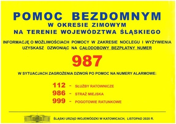 Przypominamy, że co roku, od 1 listopada do 31 marca, działa specjalna, całodobowa infolinia, obejmująca teren całego województwa śląskiego, gdzie pod numerem telefonu 987 można uzyskać informację o możliwości pomocy osobom bezdomnym.