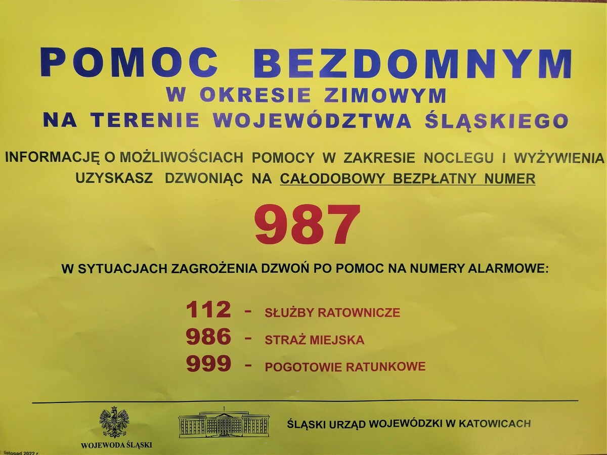 Przypominamy, że co roku od 1 listopada do 31 marca działa specjalna, całodobowa infolinia, obejmująca teren całego województwa śląskiego, gdzie pod numerem telefonu 987 można uzyskać informację o możliwości pomocy dla osób bezdomnych.