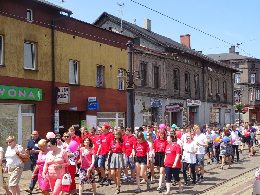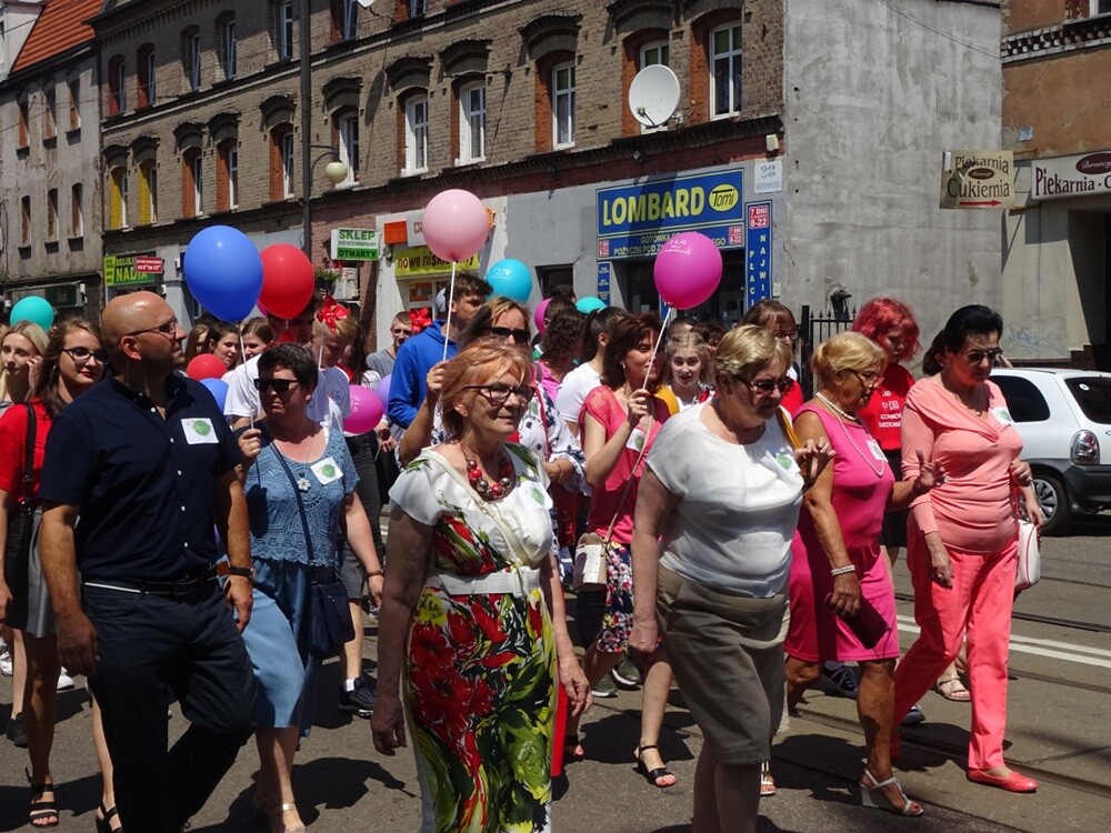 Na czele barwnego korowodu szła grupa Mażoretek UKS AZARIA z Piekar Śląskich, później orkiestra z Chorzowa Starego, następnie poczet sztandarowy, uczniowie z okolicznościowym banerem, dyrekcja i zaproszeni goście, wśród nich radni i emerytowani nauczyciele. Za nimi licealiści w kolorowych klasowych koszulkach, potem pokaźna grupa absolwentów, na końcu klasy gimnazjalne z wychowawcami.