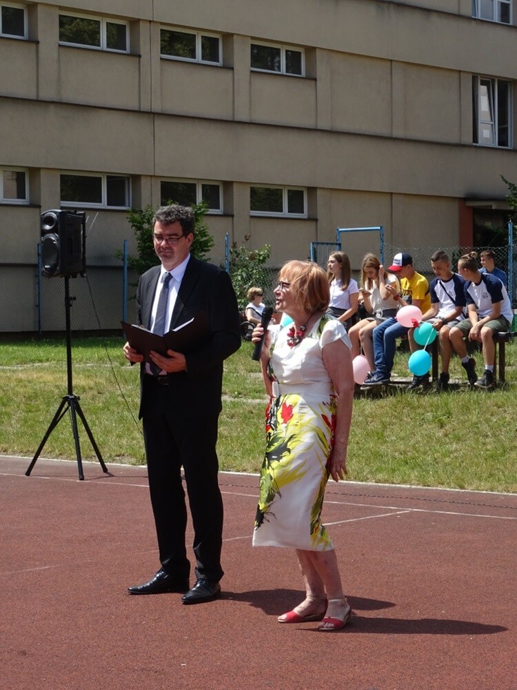 Uczestników przemarszu zgromadzonych na boisku powitał serdecznie dyrektor szkoły Mariusz Szeremeta, który przypomniał najważniejsze momenty z historii szkoły. Przedstawił również ofertę liceum, powiedział o klasach: uniwersyteckiej z językiem chińskim, dwujęzycznej, pedagogiczn–psychologicznej, medyczno–ratowniczej, sportowej z piłką siatkową. Podziękował sponsorom, a wśród nich Miejskiemu Przedsiębiorstwu Gospodarki Komunalnej, Chorzowsko - Świętochłowickiemu Przedsiębiorstwu Wodno – Kanalizacyjnemu, Przewodniczącemu Rady Miejskiej Panu Rafałowi Łatasiowi oraz Przewodniczącej Komisji Edukacji, Kultury i Sportu Pani Bożenie Wojciechowskiej – Zbylut. Z okazji jubileuszu gratulacje na ręce dyrektora złożył Przewodniczący Rady Miejskiej, a emerytowana Pani dyrektor Cecylia Chimiczewska życzyła szkole wspaniałych wyników i wielu sukcesów.