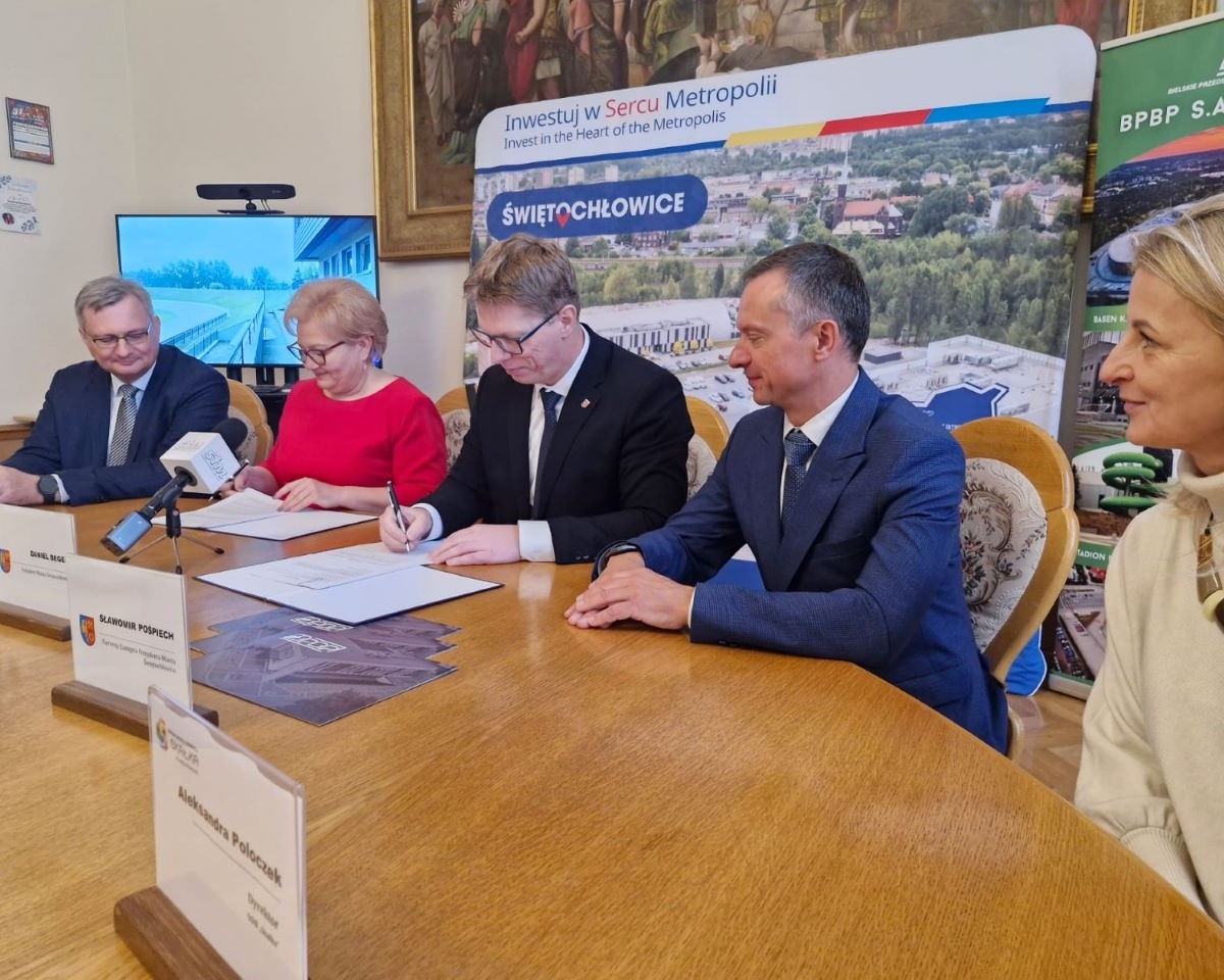 Wczoraj w Urzędzie Miejskim odbyło się podpisanie umowy na wykonanie trybun dla kibiców wokół świętochłowickiego owalu na Skałce.