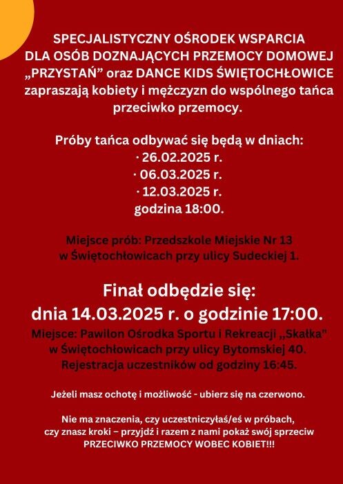 W ramach kampanii Specjalistyczny Ośrodek Wsparcia dla Osób Doznających Przemocy Domowej „Przystań” oraz DANCE KIDS ŚWIĘTOCHŁOWICE zapraszają do wspólnego tańca przeciwko przemocy.