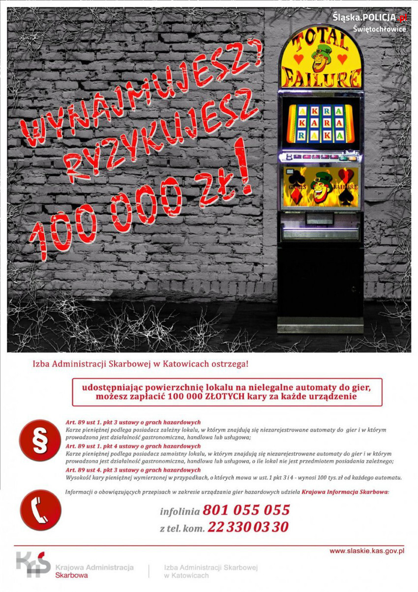 Z dniem 1 kwietnia 2017 roku weszły przepisy znowelizowanej ustawy o grach hazardowych. Za posiadanie nielegalnych automatów grożą surowe kary pieniężne tj. 100 tys. zł od jednego automatu. Takiej karze podlega zarówno urządzający nielegalne gry hazardowe, jak i właściciel lokalu, w którym taki proceder się odbywa.