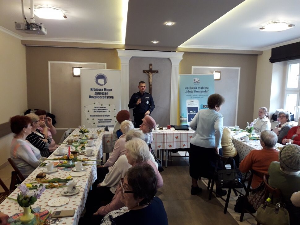 W sali przyparafialnej kościoła p.w św. Piotra i Pawła, odbyło się spotkanie dzielnicowych z seniorkami. Rozmawiano m.in. o tym jak nie dać się oszukać metodą na tzw. „WNUCZKA” czy ‘’POLICJANTA”, bezpieczeństwie w ruchu drogowym oraz o Krajowej Mapie Zagrożeń Bezpieczeństwa i aplikacji Moja Komenda. Uczestniczki otrzymały od policjantów ‘’koperty życia’’ oraz elementy odblaskowe.
