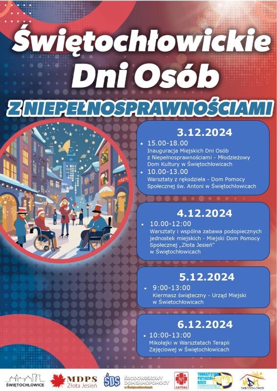 - 3 grudnia 2024 r. godz. 15.00-18.00, Inauguracja Miejskich Dni Osób z Niepełnosprawnościami – Młodzieżowy Dom Kultury w Świętochłowicach. W programie pokaz malowania piaskiem, występ uczestników Środowiskowego Domu Samopomocy w Świętochłowicach, pokaz baniek mydlanych, potańcówka. Natomiast w godz. 10:00-13:00 mieszkańcy będą mogli wziąć udział