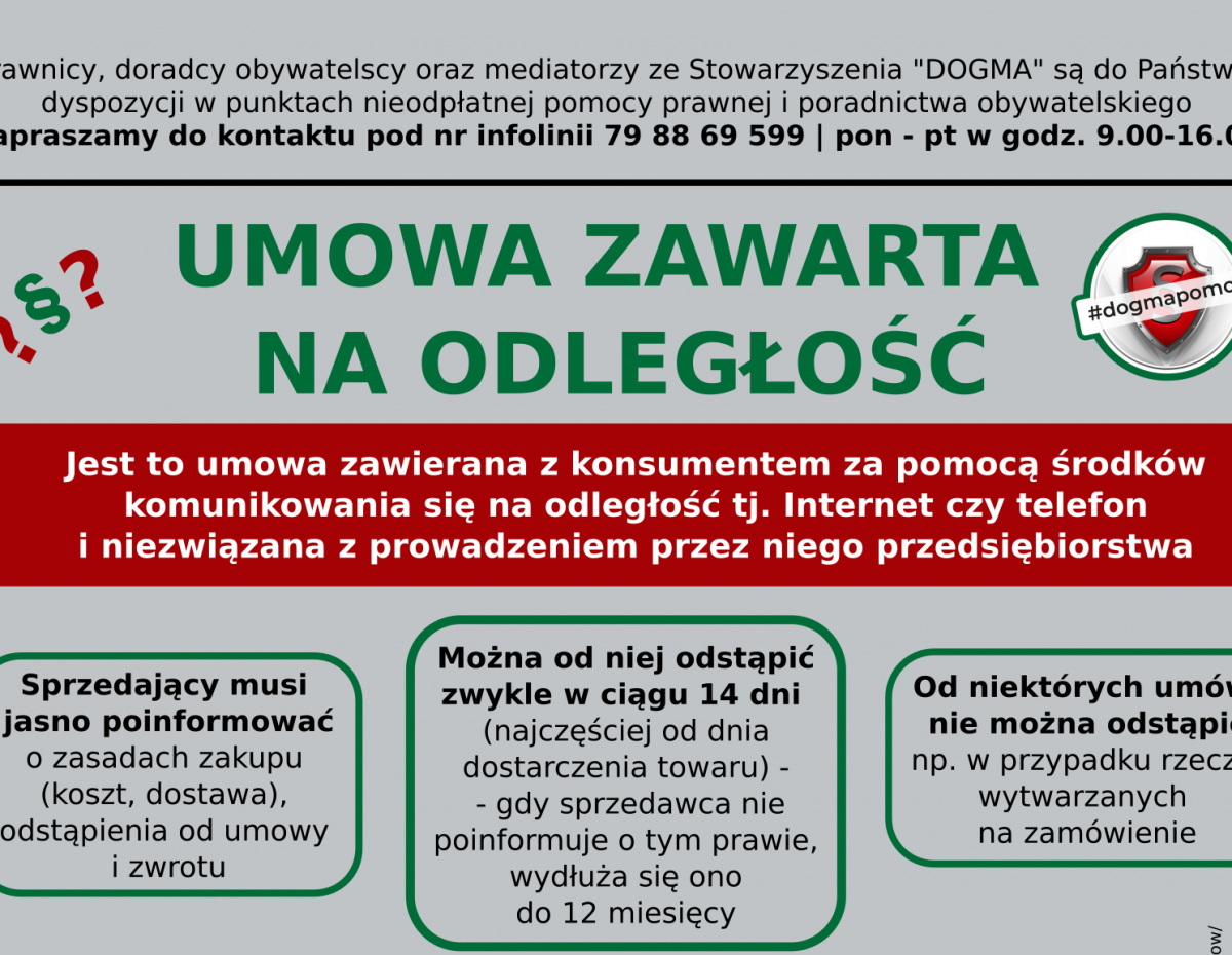 Stowarzyszenia „DOGMA” przypomina o funkcjonowaniu dodatkowego numer telefonu/infolinii pod numerem 79 88 69 599, pod którym można uzyskać informacje na temat warunków i zasadach korzystania z nieodpłatnej pomocy prawnej, poradnictwa obywatelskiego oraz mediacji.
