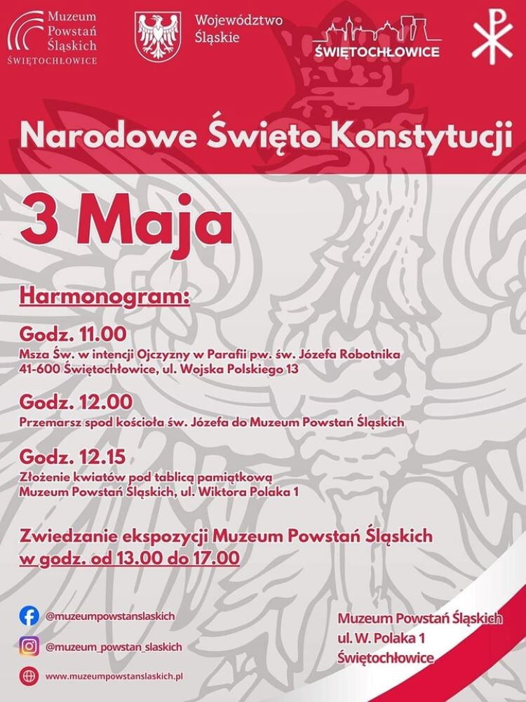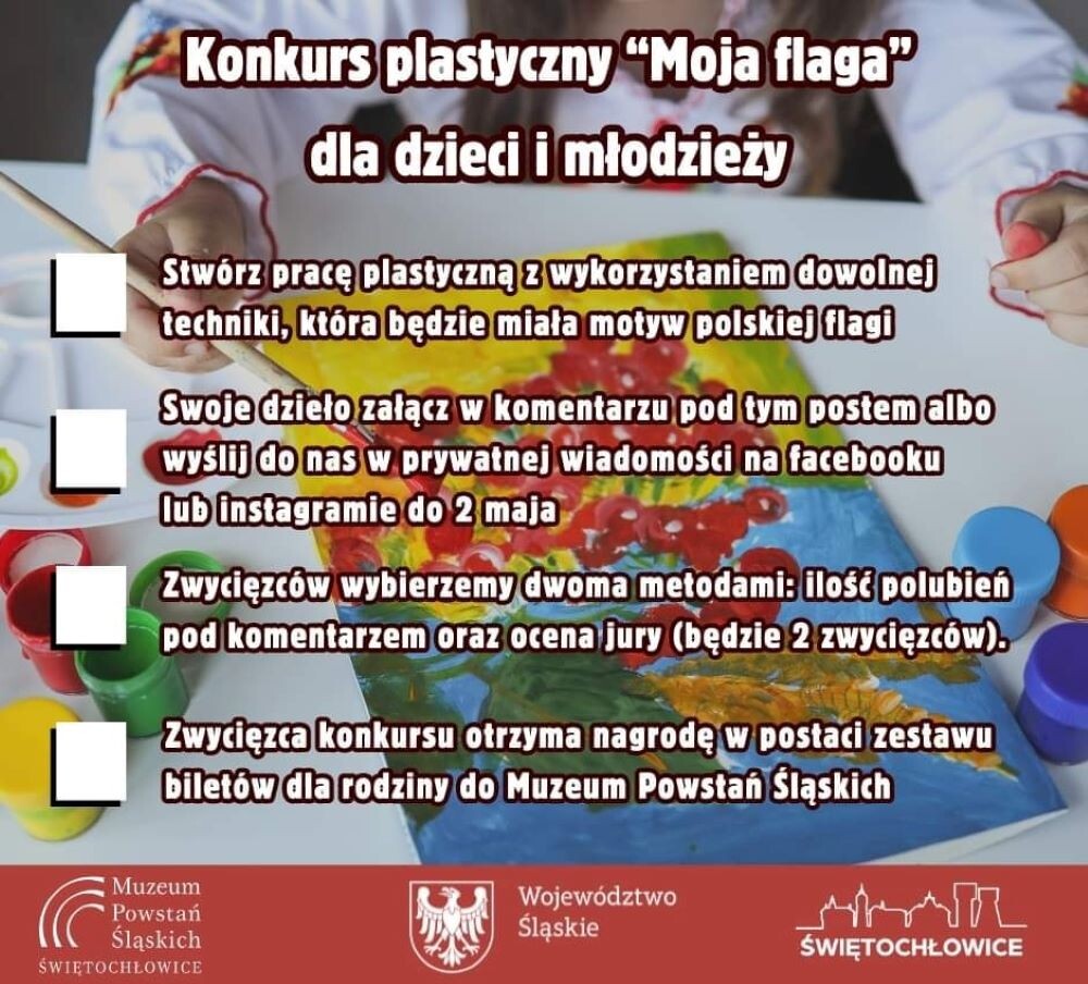 Z okazji Dnia Flagi Rzeczypospolitej Polskiej Urząd Miasta zorganizował konkurs plastyczny dla dzieci i młodzieży. Polega on na stworzeniu pracy plastycznej, która będzie zawierała motyw polskiej flagi. Uczestnicy konkursu swoje dzieła muszą zamieścić pod postem na fanpage'u Miasta Świętochłowice, bądź przesłać je przez prywatną wiadomość na facebooku lub instagramie do 2 maja. Zwycięzca konkursu otrzyma zestaw biletów dla rodziny do Muzeum Powstań Śląskich.