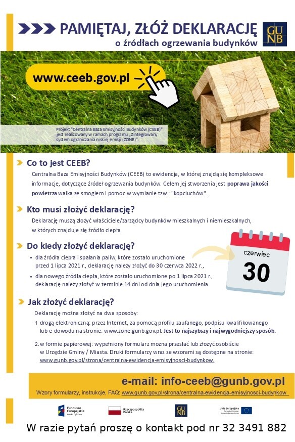 Zapraszamy również do odwiedzenia strony Centralnej Ewidencji Emisyjności Budynków, na której znajdziecie Państwo m.in. filmy instruktażowe, wzory wniosków i deklaracji oraz bogatą sekcję z odpowiedziami na najczęściej zadawane pytania (FAQ).