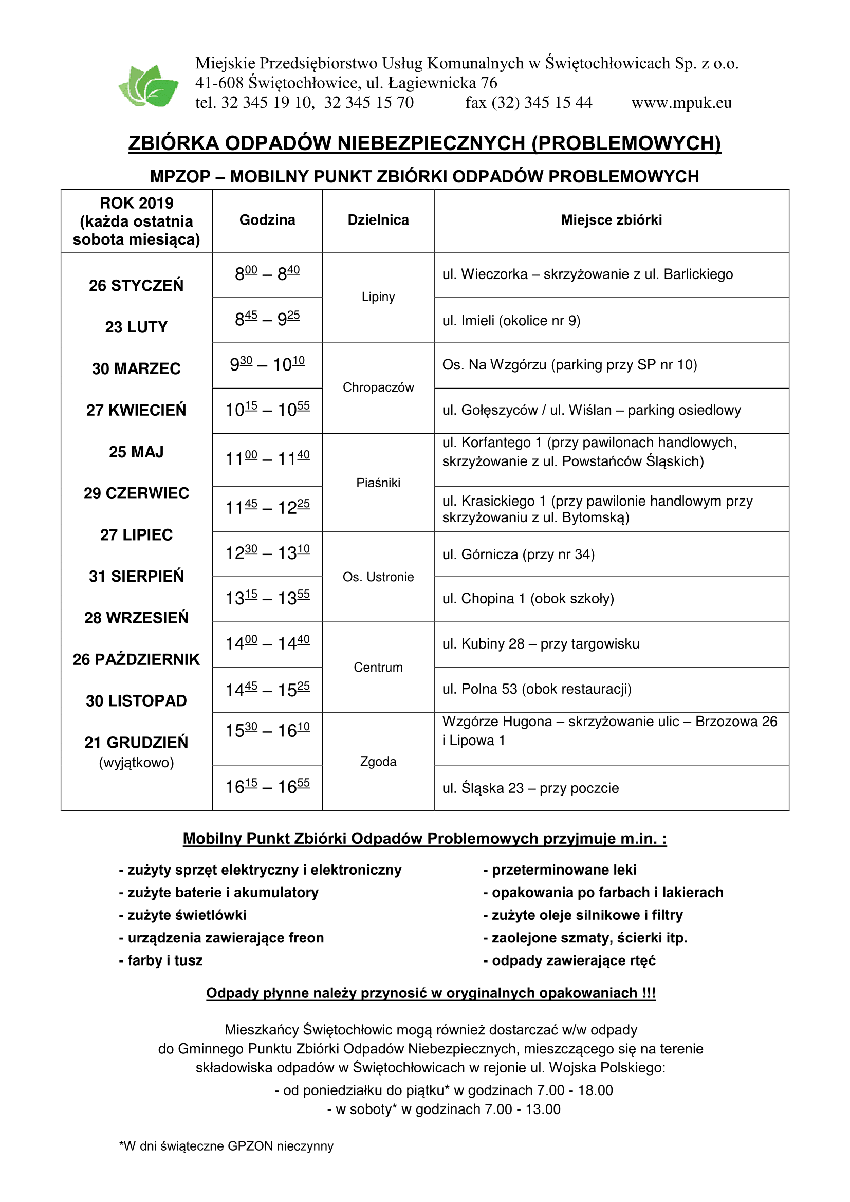 Mobilny Punkt Zbiórki Odpadów będzie w następujących dzielnicach w godzianch: