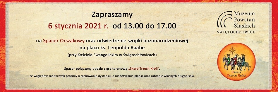 Muzeum Powstań Śląskich zaprasza 6 stycznia 2021 r. w godzinach od 13.00 do 17.00 na Spacer Orszakowy oraz odwiedzenie szopki bożonarodzeniowej! (pl. ks. Leopolda Raabe w Świętochłowicach, przy kosciele ewangelickim).