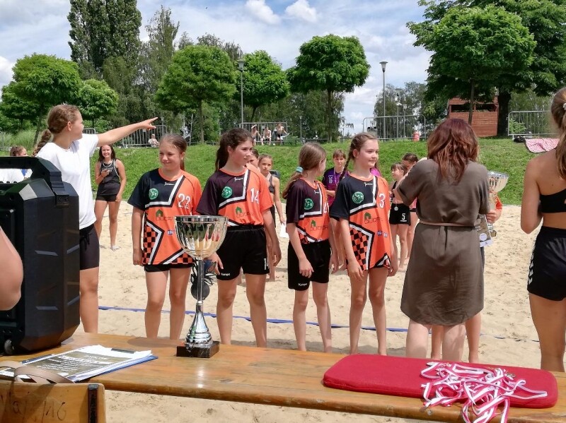 Wygrały pierwszego seta 16-14 by w drugim uznać wyższość koleżanek z Rudy 23 - 19 ale w shootoutach zwyciężyły muksiarki 5 - 3. I to było jedyne zwycięstwo miejscowych w turnieju gdzie z meczu na mecz przy słonecznej pogodzie uchodziło z nich powietrze i opadały z sił. W kolejnych meczach zespół Zgody Ruda Śląska nie miał problemów z pokonaniem SPR Grunwald 2 - 0 , a w drugiej rundzie poradził sobie z MUKS Skałka - Śląsk 2 – 0 i SPR Grunwald 2 - 0. Po dobrej porcji biegania i zabawy na piasku w sportowej rywalizacji zwyciężył zespół KS Zgoda Ruda Śląska przed SPR Grunwald Ruda Śląska i gościnnymi szczypiornistkami z Świętochłowic które zajęły III miejsce. Imprezę prowadziła Agata Mraczek z Działu Sportu, Rekreacji i Imprez OSiR Skałka a puchary, medale i dyplomy na zakończenie turnieju wręczyła Pani Dyrektor OSiR Skałka Elżbieta Augustyn - Komandera.