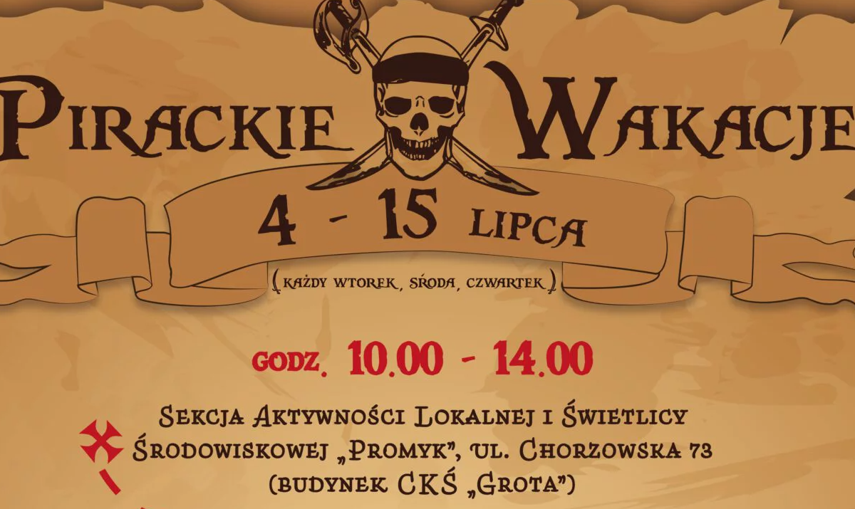Sekcja Aktywności Lokalnej i Świetlicy Środowiskowej „Promyk” w Świętochłowicach od 4 do 15 lipca, w każdy wtorek, środę i czwartek, od godz. 10.00 do godz. 14.00 organizuje „Pirackie wakacje” dla najmłodszych mieszkańców naszego miasta. Z bezpłatnych zajęć mogą skorzystać dzieci w wieku od 8 do 13 lat.