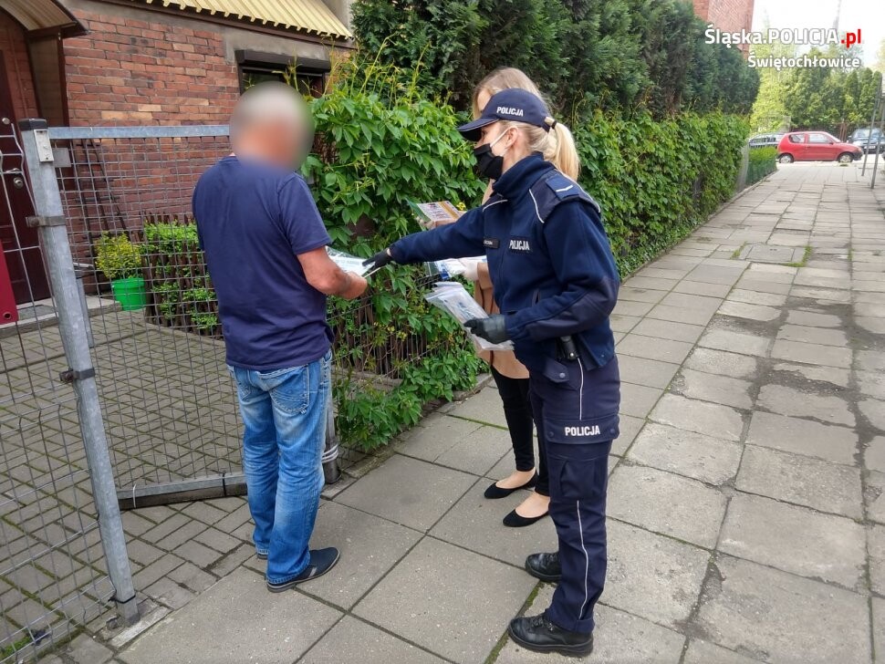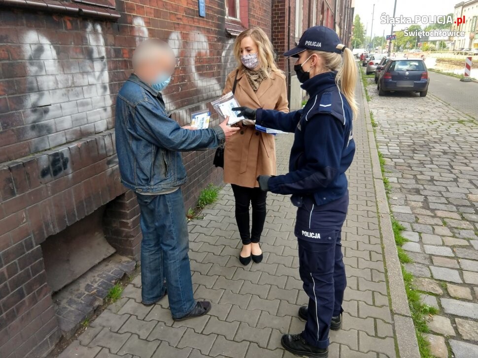 Świętochłowicka policyjna profilaktyk wspólnie z przedstawicielką miejscowego Centrum Wsparcia Seniora wręczały osobom starszym bezpłatne maseczki ochronne w związku z koniecznością zakrywania ust i nosa m.in. podczas poruszania się w przestrzeni publicznej.