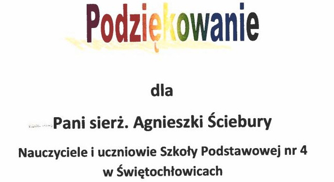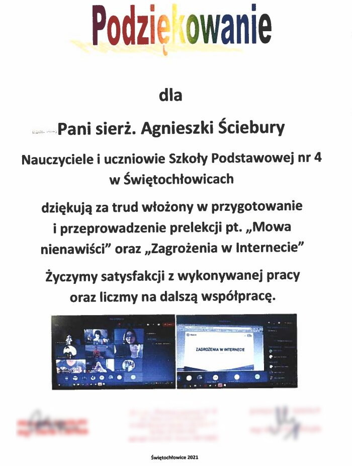 Do świętochłowickiej komendy wpłynęły kolejne podziękowania. Grono pedagogiczne i uczniowie świętochłowickiej Szkoły Podstawowej nr 4 wyrazili słowa uznania dla profilaktyk z miejscowej komendy za wykłady online poświęcone m.in. mowie nienawiści i zagrożeniom w internecie. Jednocześnie przekazali policjantce życzenia satysfakcji z wykonywanej pracy.