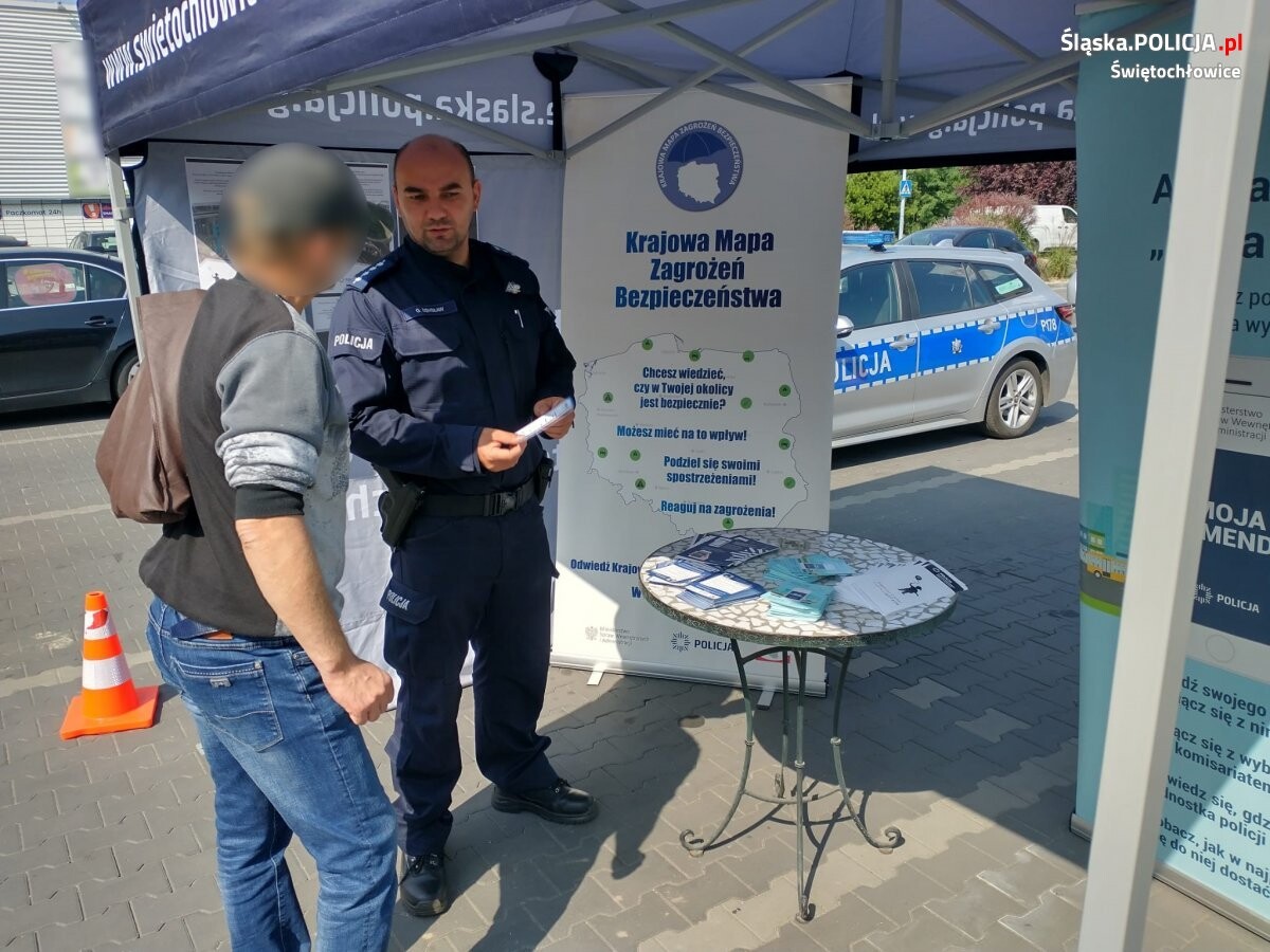 Policjanci ze świętochłowickiej komendy pojawili się wraz z mobilnym stanowiskiem pod centrum handlowym przy ulicy Chorzowskiej. Dzięki współpracy na rzecz bezpieczeństwa pomiędzy Policją a placówką handlową, mundurowi po raz kolejny mieli możliwość spotkać się osobiście z mieszkańcami miasta, którzy odwiedzili market. Na specjalnie przygotowanym, mobilnym centrum bezpieczeństwa, policjanci prezentowali i omawiali działanie aplikacji Moja Komenda oraz Krajowa Mapa Zagrożeń Bezpieczeństwa. Obie aplikacje w łatwy sposób można obsługiwać za pomocą telefonu komórkowego, dzięki czemu w szybki sposób można znaleźć m.in. kontakt do swojego dzielnicowego bądź powiadomić Policję o zauważonych zagrożeniu.