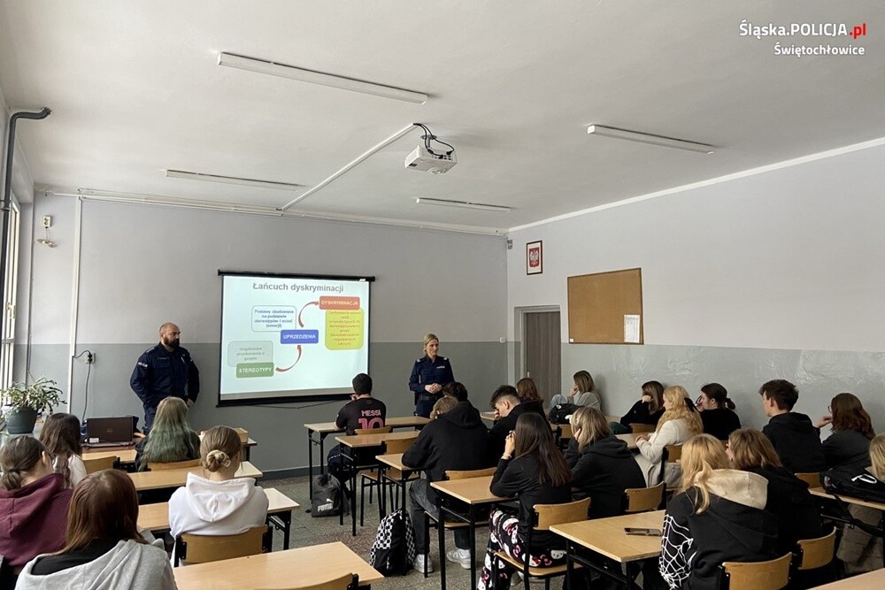 Policjanci ze świętochłowickiej komendy odwiedzili I Liceum Ogólnokształcące w Świętochłowicach. W ramach zadań profilaktycznych mundurowi opowiadali uczniom o tym, skąd bierze się dyskryminacja, uprzedzenia i jak nie poddać się stereotypom, które mogą prowadzić do hejtu oraz mowy nienawiści. Przeprowadzona prelekcja poruszała bardzo wrażliwą tematykę. Przytoczono także kilka aspektów prawnych, dzięki którym policja może eliminować tego typu zachowania. Znajomość konsekwencji prawnych dyskryminacji i mowy nienawiści pozwoli tym młodym jeszcze osobom zrozumieć skalę i powagę problemu. Uczniowie z zaangażowaniem uczestniczyli w spotkaniu, chętnie odpowiadali na pytania i dzielili się swoimi dotychczasowym doświadczeniami i problemami, które ich otaczają.