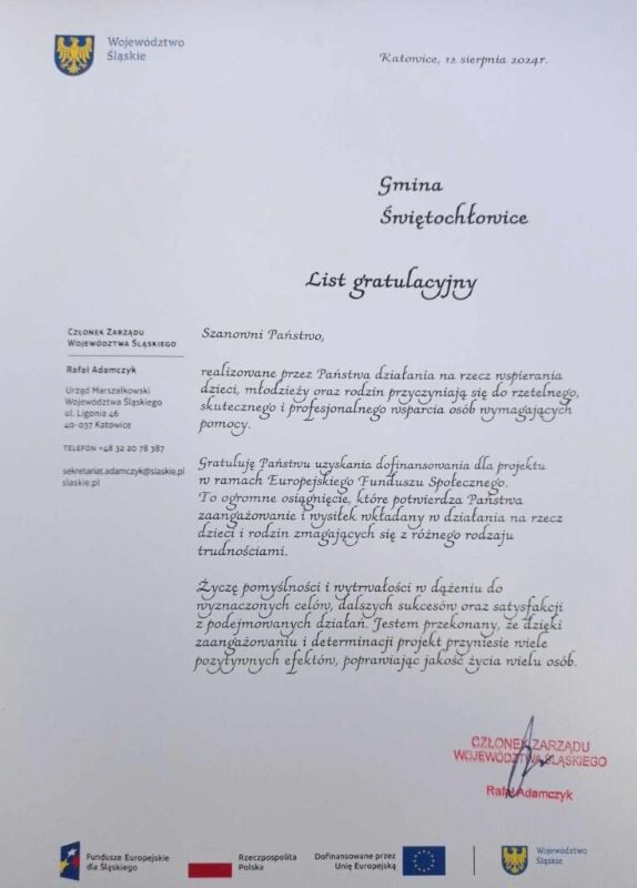 Wczoraj w Urzędzie Marszałkowskim Województwa Śląskiego Członek Zarządu Województwa Śląskiego Rafał Adamczyk wręczył I Zastępcy Prezydenta Miasta Świętochłowice Sławomirowi Pośpiechowi oraz Monice Szpoczek – Dyrektor OPS w Świętochłowicach – list gratulacyjny dotyczący wsparcia potrzebujących i oferowanej przez miasto pomocy.