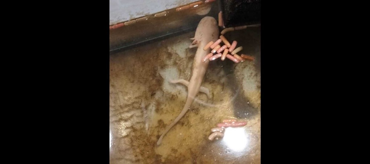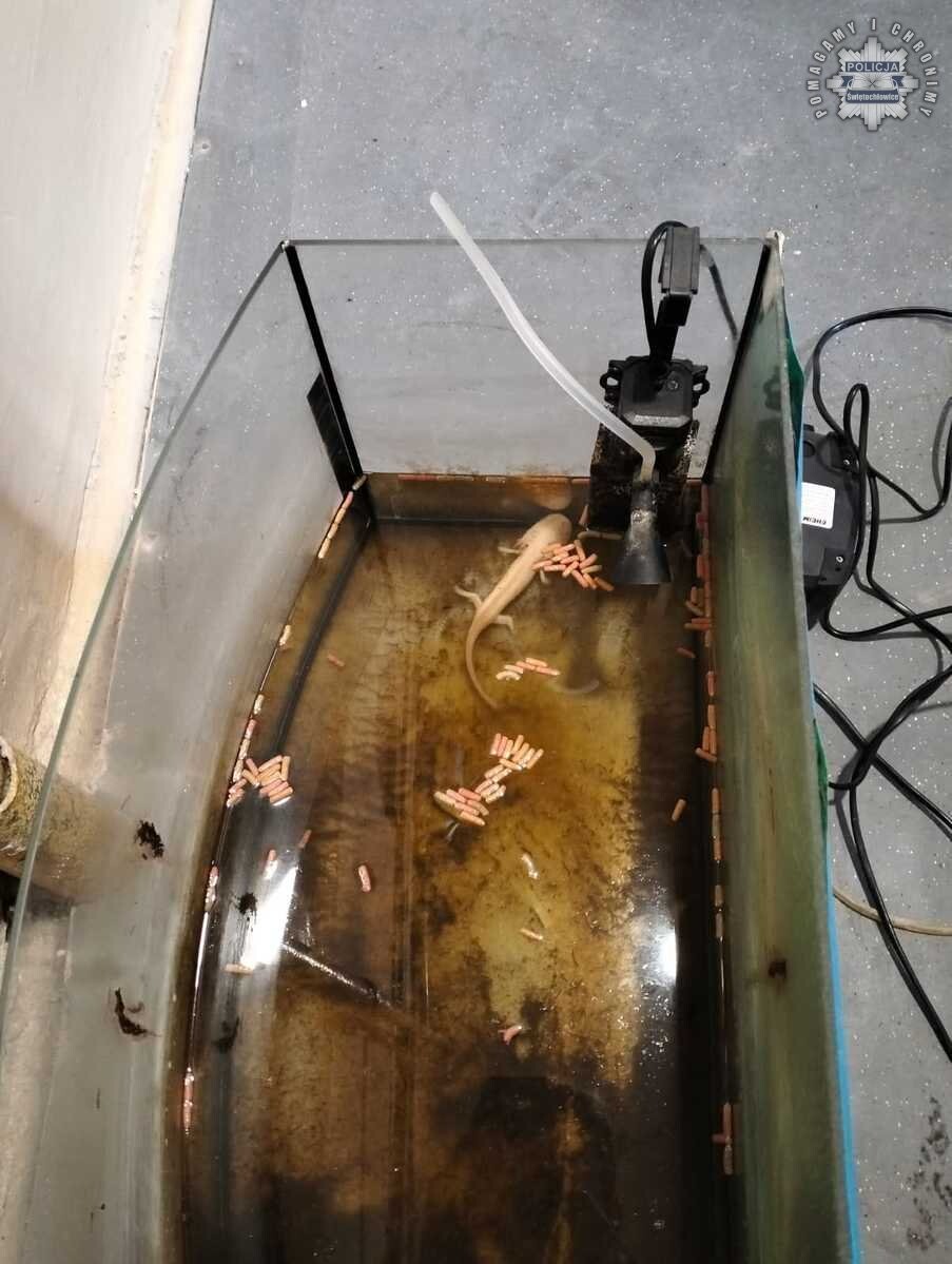 Podczas czynności okazało się, że przedstawiciel gatunku objętego ochroną CITES – Ambystoma meksykańska, znana również jako aksolotl, przebywało w brudnym akwarium, w którym zalegały rozkładające się resztki pokarmu oraz odchody. Woda nie była odpowiednio filtrowana, a brak chłodziarki uniemożliwiał utrzymanie odpowiedniej temperatury wymaganej dla tego wrażliwego gatunku. Zaniedbania te doprowadziły do poważnych zmian w stanie zdrowia zwierzęcia w tym do zaniku skrzeli oraz utraty fragmentów kończyn.