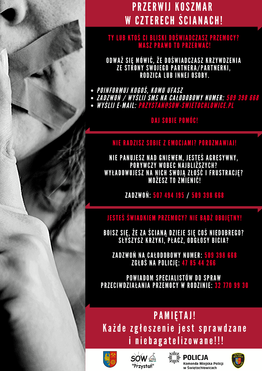 Miasto Świętochłowice rozpoczęło kampanię „Przerwij koszmar w czterech ścianach!” adresowaną do osób krzywdzonych, agresorów oraz świadków przemocy.