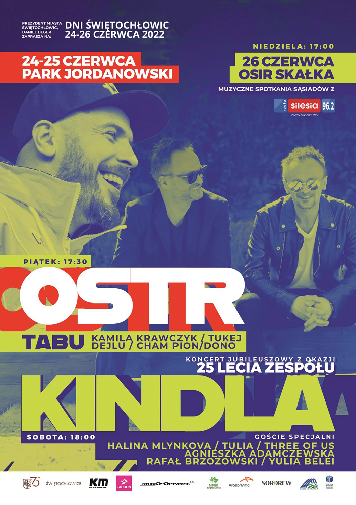 W tym roku miejscem spotkania świętochłowiczan podczas dni miasta będzie wyjątkowo Park Jordanowski. To tam w pierwszy wakacyjny weekend, czyli 24-26 czerwca w jednym miejscu spotkają się takie gwiazdy jak O.S.T.R. czy zespół Tulia! Muzycznym gospodarzem obchodów będzie zespół KINDLA, który obchodzi 25-lecie istnienia i swój jubileuszowy, jedyny koncert zaplanował właśnie w tym mieście. Do wspólnego świętowania bracia Kindla zaprosili swoich muzycznych przyjaciół.