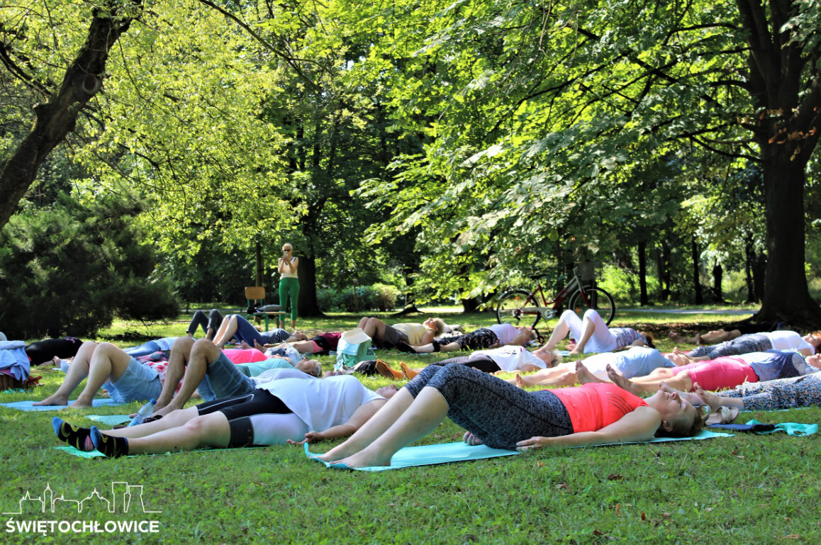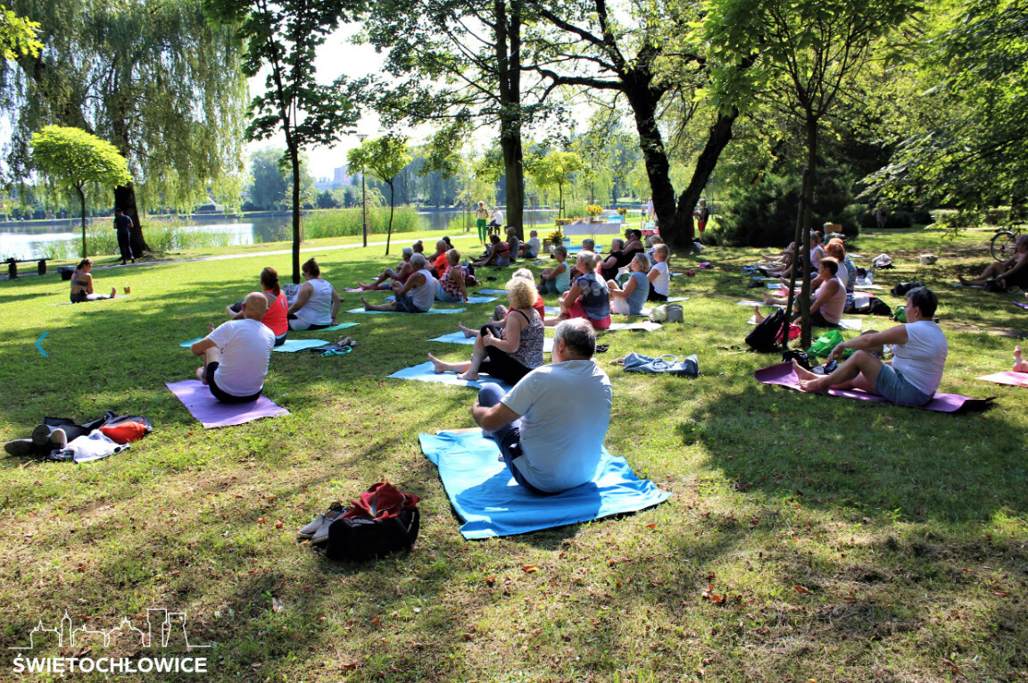 Seniorzy, którzy na co dzień uczęszczają na zajęcia z Holi Vitta w Młodzieżowym Domu Kultury w Świętochłowicach oraz w Centrum Integracji Międzypokoleniowej w Chorzowie tym razem spotkali się na wspólnych ćwiczeniach w plenerze.
