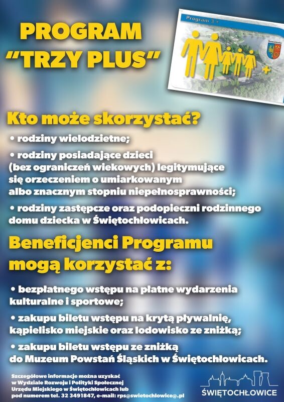 Program „Trzy Plus” skierowany jest do członków rodzin wielodzietnych (tj. mających na utrzymaniu troje lub więcej dzieci w wieku do 18 roku życia lub do 25 roku życia w przypadku gdy dziecko uczy się lub studiuje) lub posiadających dzieci (bez ograniczeń wiekowych) legitymujących się orzeczeniem o umiarkowanym albo znacznym stopniu niepełnosprawności, rodzin zastępczych oraz podopiecznych rodzinnego domu dziecka w Świętochłowicach.