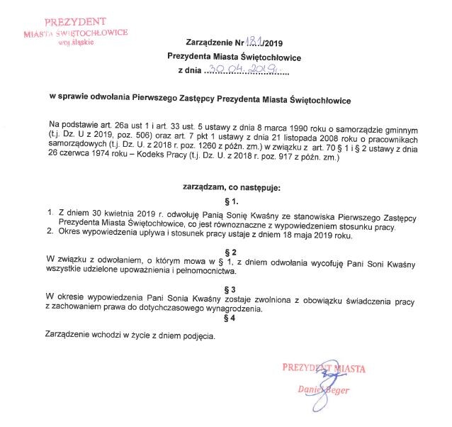 29 kwietnia prezydent Świętochłowic Daniel Beger podjął decyzję o odwołaniu swojej zastępczyni Sonii Kwaśny z pełnienia funkcji wiceprezydenta miasta - taka informacja została oficjalnie opublikowana w Biuletynie Informacji Publicznej.