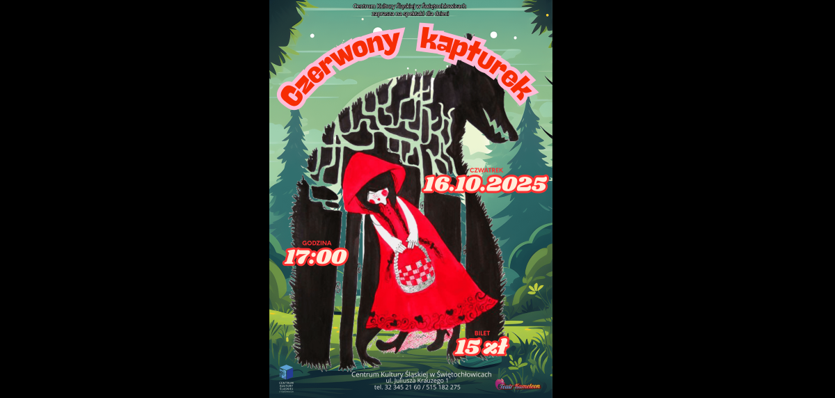 „Babciu, a czemu masz takie wielkie oczy?” – klasyczne pytanie z bajki zabrzmi na nowo już 16 października w Centrum Kultury Śląskiej w Świętochłowicach. Tego dnia o godz. 17:00 odbędzie się spektakl dla dzieci „Czerwony Kapturek”, który rozbawi nie tylko najmłodszych, ale i ich rodziców.