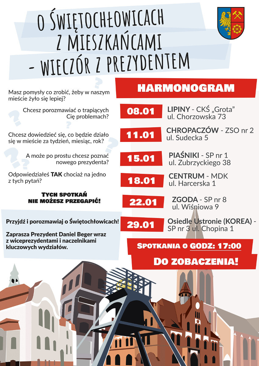 Koniec ubiegłego roku był dla Świętochłowic czasem zmian. W wyborach samorządowych mieszkańcy miasta powierzyli misję kierowania Świętochłowicami Danielowi Begerowi. Po pierwszych kilku tygodniach urzędowania i zapoznawaniu się z kondycją miasta, prezydent zaprasza wszystkich mieszkańców na spotkania, podczas których będzie można nie tylko poznać go bliżej, ale także w przyjaznej atmosferze porozmawiać o wizji rozwoju Świętochłowic i inwestycjach, które zostaną przeprowadzone w najbliższym czasie,