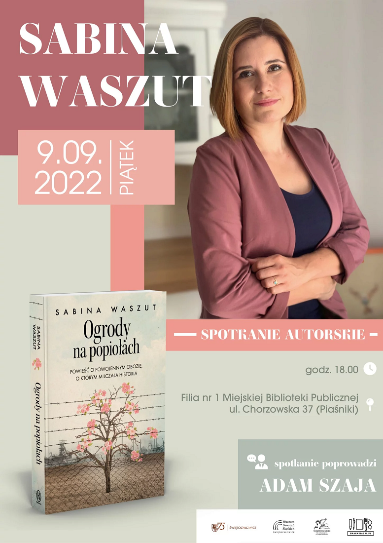 Urząd Miasta w Świętochłowicach zaprasza na spotkanie autorskie z pisarką Sabiną Waszut w związku z premierą jej najnowszej książki "Ogrody na popiołach", której zdecydowana większość akcji dzieje się w Obozie Zgoda w Świętochłowicach.