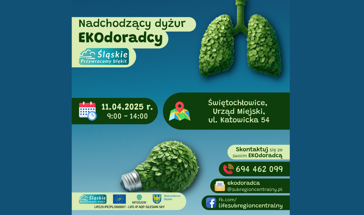 Udział w dyżurze jest bezpłatny i otwarty dla wszystkich zainteresowanych. Konsultacje będą prowadzone przez Ekodoradcę Subregionalnego Związku Gmin i Powiatów Subregionu Centralnego Województwa Śląskiego w ramach projektu LIFE „Śląskie. Przywracamy błękit”.