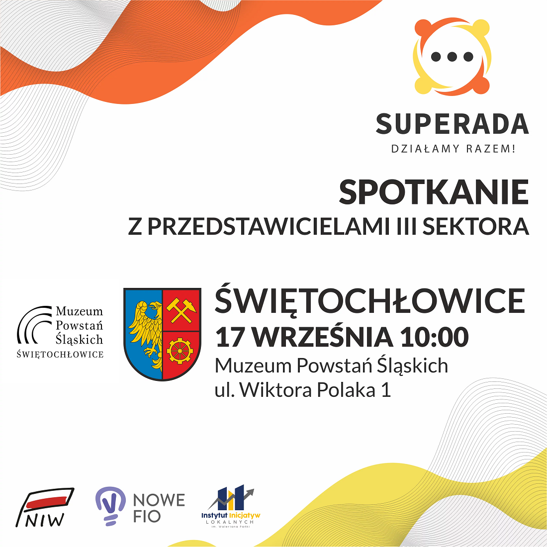 W najbliższą sobotę 17 września o godz. 10.00 wszyscy przedstawiciele organizacji pozarządowych działających na terenie miasta Świętochłowice zaproszeni zostali do udziału w spotkaniu realizowanym w ramach projektu "Superada", które odbędzie się w siedzibie Muzeum Powstań Śląskich w Świętochłowicach (ul. Wiktora Polaka 1).