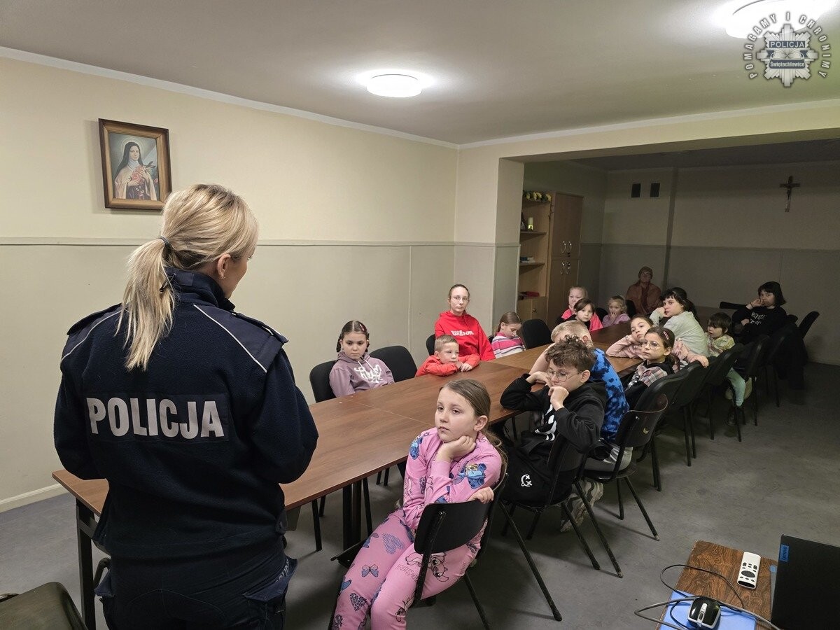 sierż. szt. Agnieszka Ściebura — profilaktyk ze świętochłowickiej komendy odwiedziła uczestników półkolonii zgrupowania przyparafialnego w dzielnicy Lipiny. Rozmawiała z dziećmi na temat bezpieczeństwa podczas trwających ferii zimowych. Omówiła, jak bezpiecznie korzystać z atrakcji zimowych takich jak narty czy sanki. Wspomniała również o tym, jak niebezpieczne mogą być takie zachowania jak wchodzenie na zamarznięte zbiorniki wodne, organizowanie kuligów za pojazdami, czy rzucanie śnieżkami w nadjeżdżające samochody. Nie zabrakło także ostrzeżeń przed kontaktami z nieznajomymi, czy podstawowych zasad obowiązujących pieszych w ruchu drogowym.
