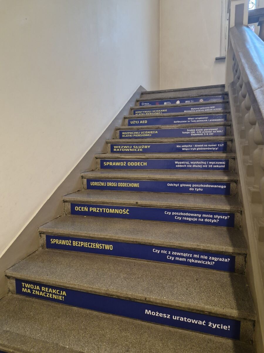 Każdy, kto będzie teraz wchodził po schodach będzie miał możliwość zwiększenia swojej wiedzy w zakresie kroków jakie należy podjąć podczas udzielania pierwszej pomocy.