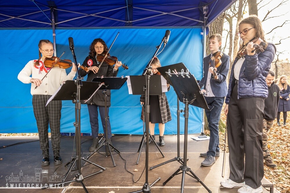 Później mieszkańcy Świętochłowic wspólnie odśpiewali hymn narodowy Rzeczypospolitej Polskiej. Na scenie natomiast podczas koncertu "Niepodległość w dźwiękach" zaprezentowali się młodzi świętochłowiccy artyści.