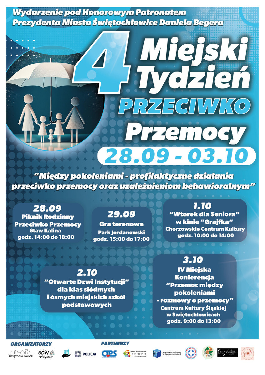 To bardzo ważny czas, który jest doskonałą okazją do mówienia wprost o różnych formach przemocy, a także o problemie uzależnień od alkoholu i narkotyków, które często potęgują przemoc. W wydarzeniu, oprócz mundurowych z Komendy Miejskiej Policji w Świętochłowicach, wezmą udział organizatorzy: Urząd Miasta Świętochłowice, Poradnia Psychologiczno-Pedagogiczna, Specjalistyczny Ośrodek Wsparcia dla Osób Doznających Przemocy Domowej „Przystań” oraz partnerzy: Ośrodek Pomocy Społecznej w Świętochłowicach, Ośrodek Sportu i Rekreacji „Skałka”, Centrum Kultury Śląskiej w Świętochłowicach, Gryfny Patrol, Specjalistyczny Ośrodek dla Osób Doznających Przemocy Domowej w Chorzowie i Koło Naukowe Uniwersytetu Śląskiego w Katowicach.