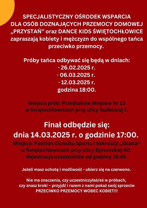 Przed wydarzeniem głównym odbędą się próby tańca w dniach 26.02.2025 r., 06.03.2025 r., i 12.03.2025 r. o godzinie 18.00 w Przedszkolu Miejskim nr 13 w Świętochłowicach przy ul. Sudeckiej 1.