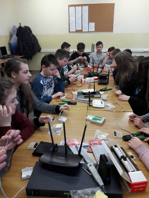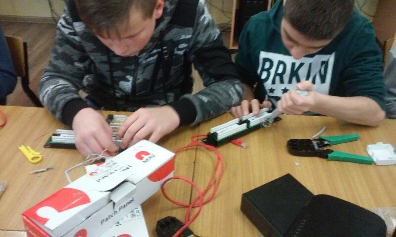 W pracowni informatycznej młodzież uczestniczyła w zajęciach praktycznych z montażu okablowania sieciowego. Korzystając z profesjonalnych narzędzi przygotowywali kable do montażu w patch panelach i gniazdkach sieciowych, a następnie samodzielnie montowali przygotowane skrętki. Odważniejsi podjęli udane próby zamontowania na końcówce skrętki wtyczki RJ-45.